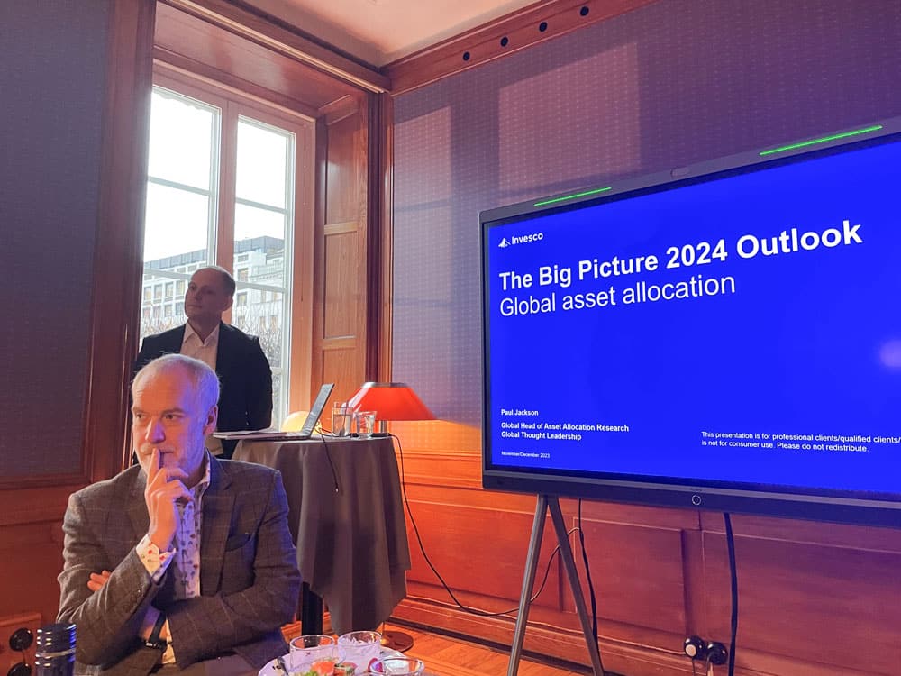 Stockholm (NordSIP) – On Wednesday, November 20th, a group of Swedish investors gathered at Nobis Hotel to hear from Paul Jackson, Global Head of Asset Allocation Research at Invesco, about his outlook for 2024. The economist provided the audience with a thorough review of macroeconomic trends, not least of which his view that we are through the worst part of the latest bout of inflation and that he expects that policy rates have also peaked and will start falling at some point in the second quarter of next year.