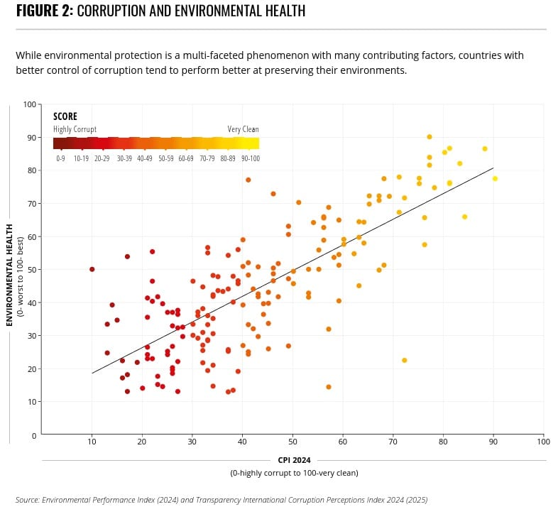 The report also draws attention to the crippling interplay between corruption and the climate crisis. Pervasive corruption weakens governance structures and diverts climate finance intended to reduce emissions and build resilience. Corruption can also compromise transparency in environmental decision-making, which leads to unfair outcomes and the destruction of natural resources. Beyond the strong correlation between CPI and the Environmental Performance Index (EPI), the report highlights FirstEnergy’s alleged US$60 million bribery case in Ohio, USA, as well as a systematic review of climate change effects on vulnerable populations in the Global South to underscore this point.