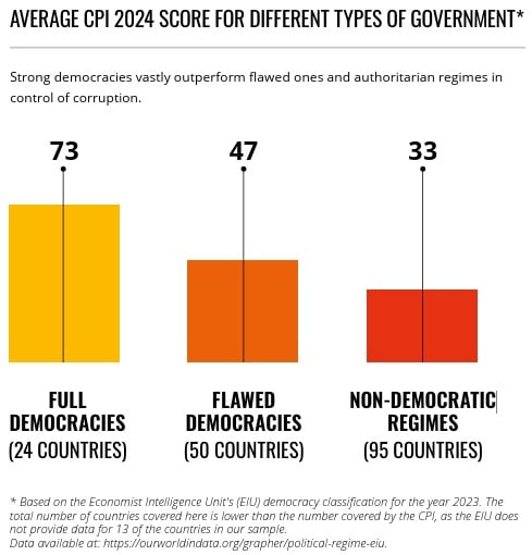 Using the Economist Intelligence Unit’s (EIU) measure of democratic development, Transparency International also notes the relationship between institutions and corruption, highlighting that CPI increases as democratic standards improve: full democracies average a CPI score of 73, while flawed democracies lag at 47, and non-democratic regimes score a mere 33. This divergence underscores the role of robust institutions, transparency, and civic institutions in curbing corruption.
