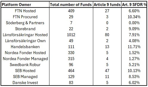 FTN is not an outlier in terms of the share of its funds that are Article 9. At 3 Article 9 funds out of 29 procured funds, it is actually one of the best, relatively speaking. FTN has a wider offering than Söderberg & Partners, who only lists 7 funds all of which are Article 8. Storebrand’s list of 22 funds¹ only includes 2 Article 9 funds: Storebrand Global Solutions and Storebrand Grön Obligation. Länsförsäkringar offers 80 Article 9 funds, out of a total 1012 funds on their platform. However, of these, only 2 Article 9 funds are a part of the 49 funds managed by Länsförsäkringar’s own funds. 13 of the 111 funds on Handelsbanken Fonder’s platform are aligned with Article 9. Of the 315 Nordea funds listed on Nordea Fonder’s platform, only 4 could be identified as Article 9 ². Swedbank Robur lists 5 Article 9 funds out of all 96 funds listed on their platform. Of the 464 funds listed on SEB’s website, 47 are Article 9 funds. Of the 83 funds listed on Danske Invest’s website, 5 are Article 9 funds ³.